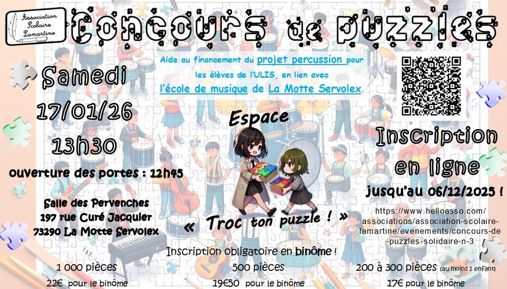 3ème concours de puzzles organisé par l’Association Scolaire Lamartine au profit de 28 ateliers de découverte et pratique des percussions à l’école de musique de La Motte Servolex pour les élèves de l’ULIS !
