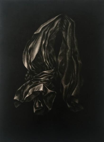 Celle des touches sur la toile, ou celle des figures représentées. Les nus dialoguent avec la mécanique brute d’un moteur d’avion. Les totems échoués des villes, plots rugueux ou cartons ramollis, contrastent avec les drapés organiques qui se font célestes.